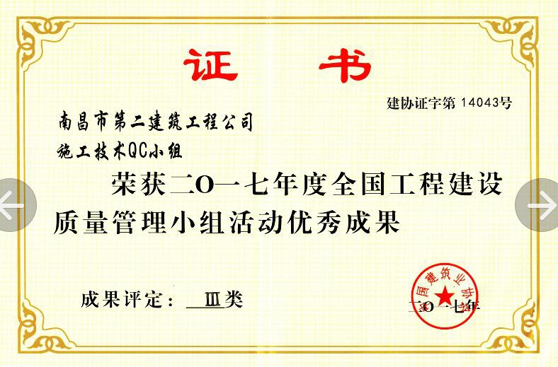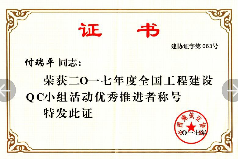 在中國建筑業(yè)協(xié)會組織的2017年度QC成果發(fā)布會上,公司QC小組的《提高GC發(fā)泡水泥保溫板外墻外保溫施工質(zhì)量》成果榮獲2017年度全國工程建設質(zhì)量管理小組活動優(yōu)秀成果獎;付瑞平同志榮獲2017年度全國工程建設QC小組活動優(yōu)秀推進者稱號。