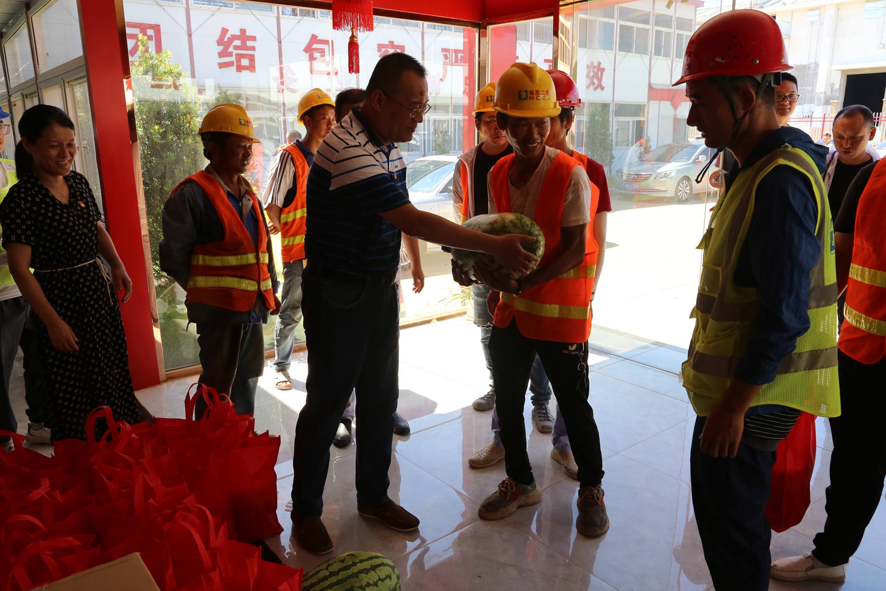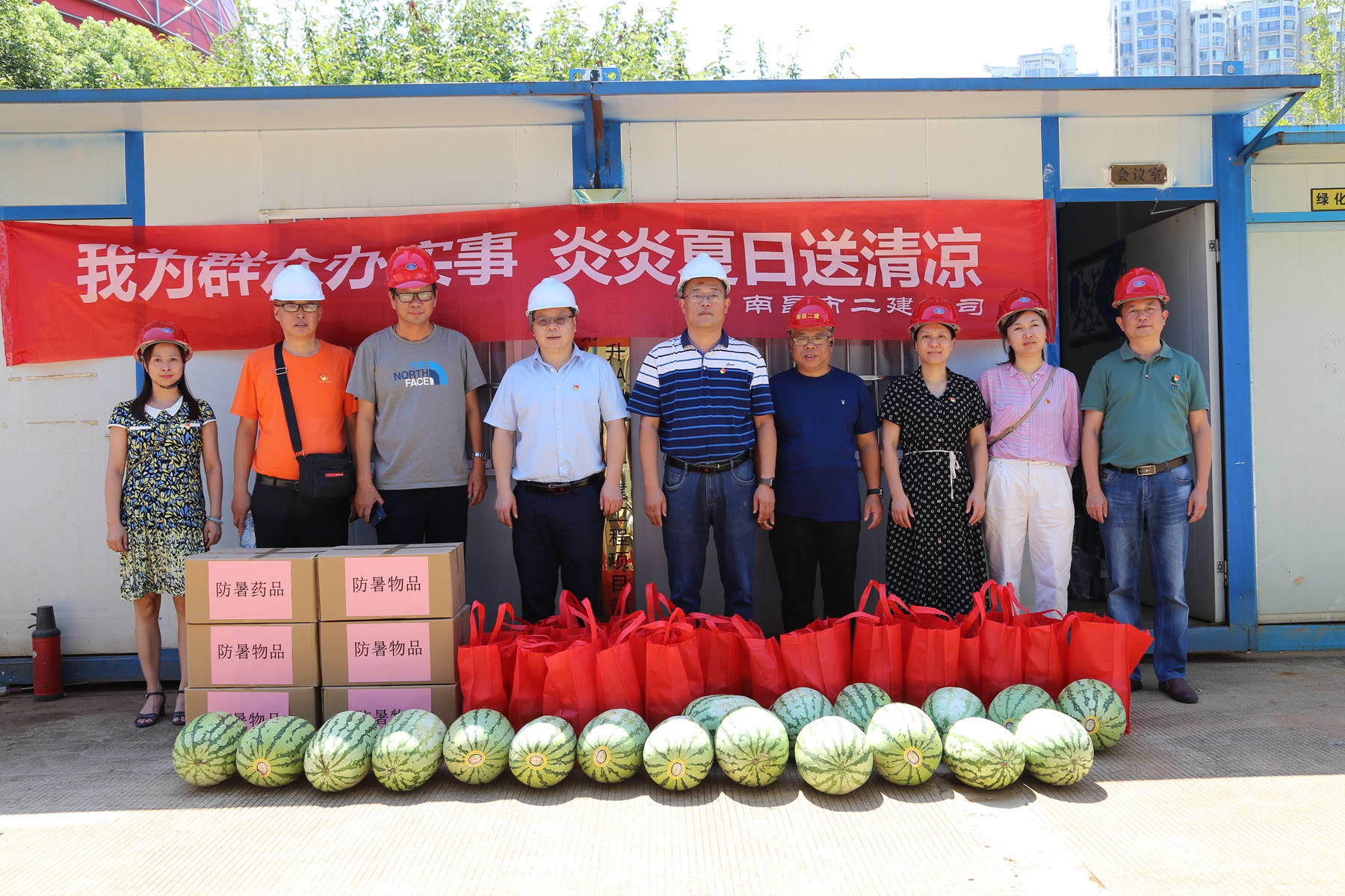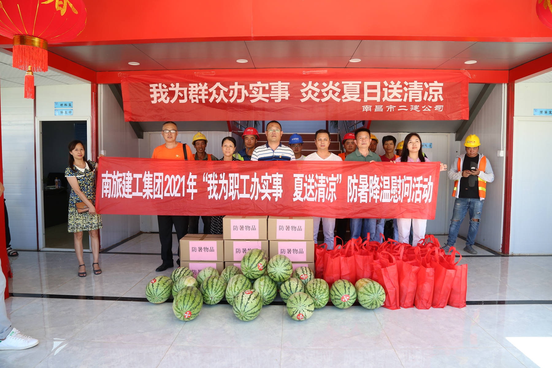 烈日炎炎,持續(xù)高溫。為了給奮戰(zhàn)在工程一線的廣大員工帶去企業(yè)的關懷,7月22日,公司相關部門在南旅建工集團總經(jīng)理、公司黨委書記、董事長王彥,南旅建工集團黨委副書記、常務副總經(jīng)理龔戩,公司紀檢書記王小華、工會主席付蓉等領導率領下,先后來到“繩金塔民俗風情街”工程項目部、“滕王閣南擴”項目部及“南昌市第六糧庫易址重建”工程項目部,開展“我為群眾辦實事 炎炎夏日送清涼”活動。每至一處,送上大批西瓜、綠豆、冰糖等防暑物品及藥品,并詢問項目部防暑降溫工作落實情況,督促項目部把工程建設與職工健康安全同時抓牢實,確保項目建設正常推進。